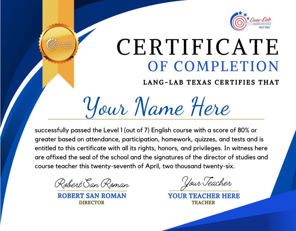 Para recibir un certificado, el alumno debe tener una calificación final de 80% o mejor y tiene que haber pagado el costo total del curso o el equivalente en clases privadas ($760 mínimo). La calificación final está basada en 4 partes: tarea, pruebas en clase, pruebas en línea, y el examen final.